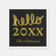 This design is modern simple and fabulous, it features pure black background with a textured metallic golden ribbon type script saying hello and customized typography for the year. Elegant script to personalize design with hosting family name, business name or location, May next year be amazing for all of you. Cheers!
