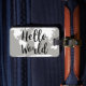 Cute "Hello World" script luggage tag with a white world map silhouette.