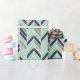 A modern geometric pattern with a multi-colored herringbone chevron pattern in tones of blue and mint green.