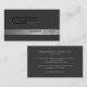 Imitation of brushed metal strip and glossy monogram on dark perforated background. Easy to read contact information on the back.