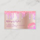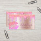 This gorgeous makeup artist business card design features faux holographic glitter lips & dripping glitter, rose gold metallic texture and elegant calligraphy font.