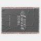 Designed with grey background and you can customize to any color you wish. "Home Sweet Home" is in white calligraphy script and block mixed lettering on the center. Customized with family's last name on lower front blanket. Makes a great gift idea for a housewarming party or bridal shower.