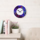 Modern wall decor clocks in a beautiful designer background in shades of purple, blue, red, and green. An artsy design that adds a touch of artitistyle to your walls in a time piece that is timeless.