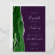 The left-hand edge of this elegant modern wedding invitation features a hunter green watercolor agate border trimmed with faux silver glitter. The customizable text combines handwriting, copperplate and italic fonts in real silver foil on a deep purple background. The reverse side features a matching green and silver agate design.
