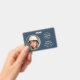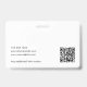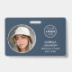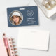 Impress with a stylish and professional identification badge. This double-sided template features your ID photo in a circle, and is personalized with a name, logo, contact information, and a scannable QR code. Customize the text to match your brand. This modern design would suit many different workplaces and professions, including corporate professionals, retail salespersons, beauty consultants, hotel staff, small businesses, conference name tags and more! Printed colors: slate blue, black and white.