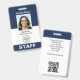 Create a professional appearance with a branded staff ID badge. This editable template can be personalized with your profile photo, name, job title, employee number, and company logo. Return details are on the back, along with additional information, and a QR code. Perfect for creating a cohesive branding experience, or simply to verify the identity of the wearer and display their qualifications. This identification badge is ideal for customer-facing roles and corporate settings — from business consultants and retail stores to medical professionals, hospital staff, office workers, conference teams, corporate events and more. Custom badges build brand identity and enhance security. Printed colors: very dark navy blue, gray and white. Vertical format.