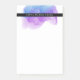 Elegant and colorful notes feature your name and/or business name in white on black, atop a vibrant watercolor inkblot illustration in ethereal shades of indigo blue and violet purple.