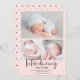 Modern introducing black pastel blush pink 3 photos baby birth announcement , with a cool elegant hand written style brush script and editable black polka dots at the back.