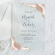 Two corners of this elegant modern wedding invitation feature ivory watercolor agate trimmed with faux gold glitter. The customizable text combines handwriting, copperplate and italic fonts in charcoal gray on a clear background.