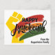 Stylish modern JUNETEENTH Postcard with CUSTOMIZABLE TEXT on the front and reverse. The design shows paint strokes in red, orange and green, with a yellow raised power fist in the background. The wording reads HAPPY JUNETEENTH in decorative script typography. You can personalize your name on the front and your message on the reverse. This Juneteenth postcard would be great to send to anyone who wants to celebrate this African American Black independence day holiday with a stylish greeting. Christian version available. There are other popular Juneteenth designs by Berean Designs to see in store. Matching gifts also available.