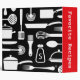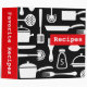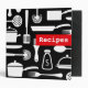 Modern black and white kitchen recipes binder (recipe book) featuring a pattern of kitchen items like pots, pans, whisks and cutlery. Red spine with customizable text "Favorite recipes". Customizable text on front "Recipes". Available in other colors. Binder only, does not come with inserts. For custom requests or help with customizing please use the store contact link above.