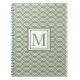 This modern, trendy notebook features a white geometric lattice all-over design with a sage green colored background. In the center is a framed monogram letter in the same sage color.