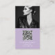 Modern white on pastel lavender purple photo qr code logo photographer business card. Add 2 photos, your logo, social media and qr code to show your price list, appointment, portfolio and more!. Simple white on lavender with a circle photo mask and an elegant modern script brush typography,