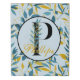 Beautiful design features background of blue and gold leaves on light blue background with monogram/ initial P with leaves embellishment in center circle. Personalize with name in yellow gold color script font