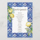 Composed of serif and cursive script typography. All against a watercolor backdrop of blue and white Mediterranean Spanish tiles with greenery foliage leaves, lemons and wild floral flower botanicals.