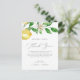 This modern lemon garden thank you reception card is perfect for a spring or summer wedding. The rustic mediterranean design features bright and beautiful watercolor lemons with bohemian white flowers and elegant green leaves. Place these cards at the table setting for each of your guests at your wedding reception. Personalize the card with your names and a special thank you message.