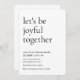 Celebrate the holidays with style and warmth using this minimalist Christmas dinner invitation. Featuring the heartfelt phrase let’s be joyful together in a clean, modern serif font, this elegant design is perfect for holiday gatherings with friends and family. With its simple layout and timeless black and white color scheme, this invitation is ideal for Christmas dinners, festive parties, or seasonal celebrations. Customize with your own event details for a chic and meaningful holiday invite.