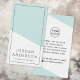 Modern, white and light aqua blue, vertical business cards with your name and title on the front with a thin black border along the edge of the card. Customizable template fields for your contact information, social media and logo on the back. You can change background and font colors, move and resize elements with the design tool. Follow us on Facebook: @businessstationery for more products, news, sales and more.