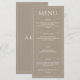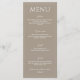 Modern and simple wedding menu in light brown. Clean and easy-to-read design that matches a minimalist modern wedding theme. Includes course description - starter, main course, desert and drinks information which is easy to edit and personalize.