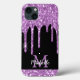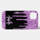 Elegant, modern, girly light purple glitter drips custom personalized name and monogrammed iphone case. This design features faux light pastel plum purple or orchid purple color glitter sparkle drips on black background with custom personalized monogram initial and first name text template. Perfect feminine gift for girl and women who loves pretty trendy glam things. If you need help or matching items, please contact to me.