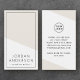 Modern, vertical business cards with your name and title on the front with a thin black border along the edge of the card. Customizable template fields for your contact information and logo on the back. You can change background and font colors, move and resize elements with the design tool.