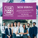 Modern, simple and eye-catching "Now Hiring" business banner; design combines a customizable magenta background with the always professional simple and easy to read white typography. Versatile design adapts to any industry or type of business. Simple update the text areas to your specific marketing and advertising needs.