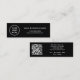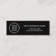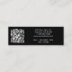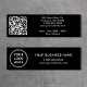 Modern and professional black mini business card for your business. The front features your logo, company name and a block of text for your slogan, contact details or other information. On the back, upload your QR code for customers to scan for a list of your products, services, prices or other information and add additional information in simple white typography.