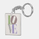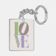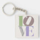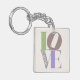Stylish wedding favor keychain, for the wedding party or each guest, with colorful graphic text reading LOVE. Personalize the text on the keychain, to suit your wedding needs.