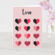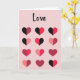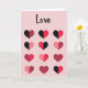 This cute Valentine's Day card features a soft pink background with the word “Love” printed near the top in loose, black brush-style lettering. Below the text, there’s a neat 3x3 set of nine hearts arranged in rows. Each heart is split down the middle into two colors, mixing black with red, black with pink, and different shades of pink and deep red. The hearts look smooth and simple, and each one has a faint shadow underneath that makes it seem slightly raised. The color pairings give the design a sweet, modern feel without being too busy. Overall, it feels like a quiet, caring note that fits romance or close friendship ❤️