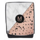 An ultra-stylish personalized backpack with a trendy rose gold pattern and black spots pattern combined white a marble pattern. A round black frame encircles your monogram and name. Edit the sample text with your desired text. This design is great for back to school, friends, family, students, and co-workers.