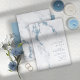 An abstract background reminiscent of glitter-veined marble in shades of dusty blue through steel blue and white is the backdrop for elegant script text and modern design layouts in the pieces of this beautiful wedding suite. The invitation shown here features a right-aligned text with an elegant marble border. Search ID816 to see other pieces and color choices for this set.