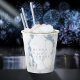 An abstract background reminiscent of glitter-veined marble in shades of dusty blue through steel blue and white is the backdrop for elegant script text and modern design layouts in the pieces of this beautiful wedding suite. The wedding paper cup shown here features centered text bordered by elegant marble. Easily add your own names and wedding date using the provided template. Search ID816 to see other pieces and color choices for this set.