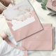 An abstract background reminiscent of glitter-veined marble in shades of rose gold is the backdrop for elegant script text and modern design layouts in the pieces of this beautiful wedding suite. The coordinating envelope shown here features a marble interior and optional rose gold and mocha watercolor exterior. Search ID816 to see other pieces and color choices for this set.