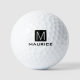 Golf balls featuring your monogram initial on a black square and the name below in a masculine font.