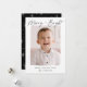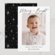 Cute, modern holiday photo card featuring the phrase "Merry & Bright" in a black hand-lettered script. Your vertical photo is displayed with a white rough edge border. Personalize the front of the card by adding a custom greeting with your family name shown below. The card reverses to display a black background with a white sparkling star pattern.