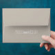 Modern Merry and Bright envelope with a gray outside, inside of gray and white diamond pattern design, and white text on the back that reads Merry and Bright.