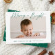Cute, modern holiday photo card featuring the phrase "Merry & Bright" in a green hand-lettered script. Your horizontal photo is displayed with a white rough edge border. Personalize the front of the card by adding a custom greeting and your family name. The card reverses to display a green background with a white sparkling star pattern.