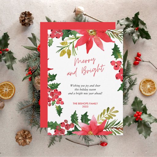 Modern Merry and Bright Script Foliage Wreath Holiday Card