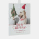 Whimsical Merry Christmas greeting in red custom fancy typography on white label with red border, photo template and customizable text fields.