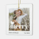 Modern Merry holiday double-sided family photo ceramic ornament. Cute white bold and black typewriter text on a white background. Add names, date and a favorite photo to personalize. The perfect family keepsake to give or keep.