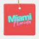 Modern and colorful typographic Christmas ornament features "Miami Florida" in aqua and pink neon text on salmon / coral background. Personalize with names and dates on back.