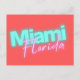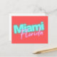 Modern and colorful typographic design features "Miami Florida" in aqua and pink neon text on salmon / coral background