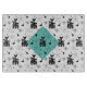 A super cute pattern of black cats, atomic starbursts and abstract shapes inspired by retro mid century designs in on lovely tones of teal, blue, black, white and grey.