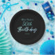 This simple and aesthetically designed paper plate features a blue color vibrant typography on a black background. Perfect party supplies for a modern and simple theme birthday celebration.