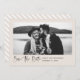 Save the date card featuring a modern minimalist clean design with brush script lettering. The reverse features a striped pattern background with room for any additional text.
