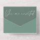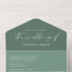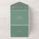 Simply seal and send these wedding invitations: Tri-fold wedding invitation with a tearaway RSVP card. This trendy Sage Green All In One Wedding Invitation features clean calligraphy script, modern typography on two tones of sage green. Delete the recipient's address to leave the space blank for address stickers. No need to send out RSVP cards or enclosure cards - this wedding invitation design covers all your needs. Simply edit the text to fit your wedding.