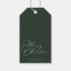 These modern ultra-minimalist fir green Christmas and holiday gift tags are contemporary, customizable and stunning. This design features handwritten cursive typography stating 'Merry Christmas' with a personalized family name component.