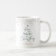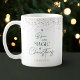 Modern Seasonal Christmas coffee mug design, featuring a Christmas tree design which reads 'Believe in the magic of Christmas' in pine green with gold glitter effect around the rim and white background. Personalize with your name or custom text and make the perfect stocking filler or gift for yourself or a loved one.