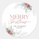 This round Christmas sticker features elegant winter greenery and berries on a white background. The design is accented with modern handwritten style text "Merry Christmas" which offers a touch of sophistication.