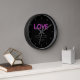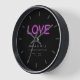 A modern minimalist, elegant, personalized wedding anniversary keepsake clock featuring a black background, the word "love" in neon letters and with a pink neon effect (this is a digital effect, not real neon ink) and modern typography. A nice custom wedding gift for a young - and young at heart - couple celebrating their 1st, 3rd, 5th, 10, 25th or 50th anniversary.